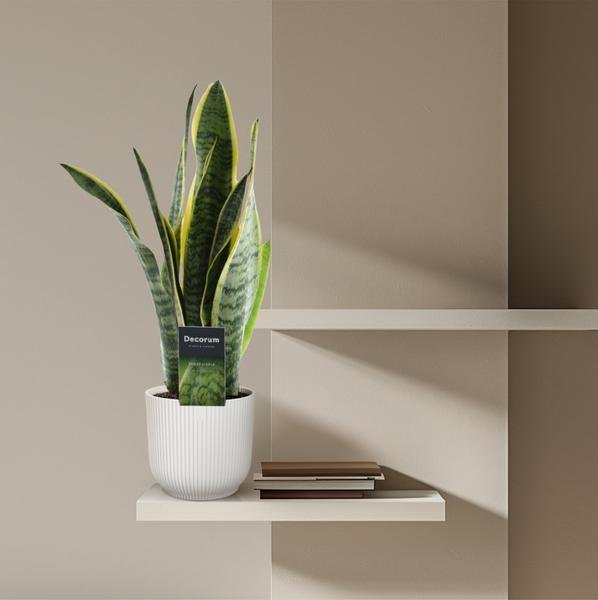 - Uiterlijk van de plant: De Sansevieria, ook wel bekend als de Vrouwentong, heeft stijve, zwaardvormige bladeren die variëren van donkergroen tot grijsgroen. De bladeren hebben vaak lichte strepen of een geelachtige rand, wat zorgt voor een modern en stijlvol uiterlijk.